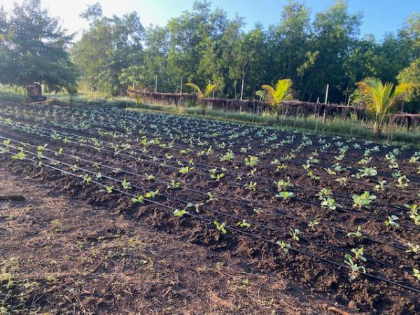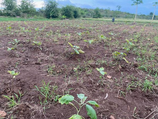 In der Betriebsgärtnerei in Mamoulé läuft alles nach Plan. Man stellt fest, das die syntropische Landwirtschaft sich sehr gut entwickelt.: innerhalb kurzer Zeit sind Pflanzen gewachsen, alles ist grün und üppig, mit einer schönen Vitalität und vielversprechendem Wachstum. Im Gegensatz dazu leiden in den Parzellen der traditionellen Landwirtschaft, in denen Auberginen und Kohl gepflanzt wurden, die Pflanzen unter der Hitze. Sie stehen auf einem freien Stück Land, ohne Schutz vor der Sonne, was ihr Wachstum einschränkt.