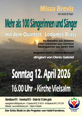 Am Sonntag, den 12. April um 16 Uhr organisiert die Organisation Haïti-Farnières ein Konzert in der Kirche von Vielsalm zugunsten ihrer Projekte in Haiti.